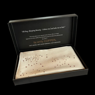 Premium 22 momme custom-fit Mulberry silk pillowcase infused with Canadian engineered COPPER and hyaluronic acid for breathable antimicrobial comfo...